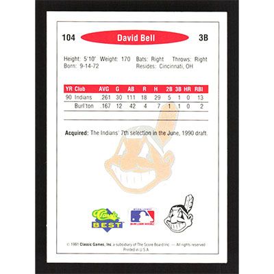 This is a 1991 Classic/Best David Bell baseball card. The card is #104 and pictures show condition.