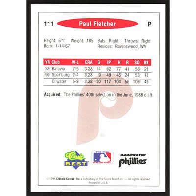 This is a 1991 Classic/Best Paul Fletcher baseball card. The card is #111 and pictures show condition.