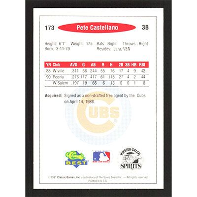 This is a 1991 Classic/Best Pete Castellano baseball card. The card is #173 and pictures show condition.