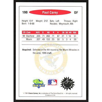 This is a 1991 Classic/Best Paul Carey baseball card. The card is #190 and pictures show condition.