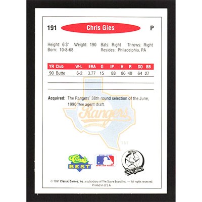 This is a 1991 Classic/Best Chris Gies baseball card. The card is #191 and pictures show condition.