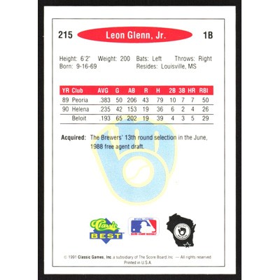 This is a 1991 Classic/Best Leon Glenn Jr. baseball card. The card is #215 and pictures show condition.