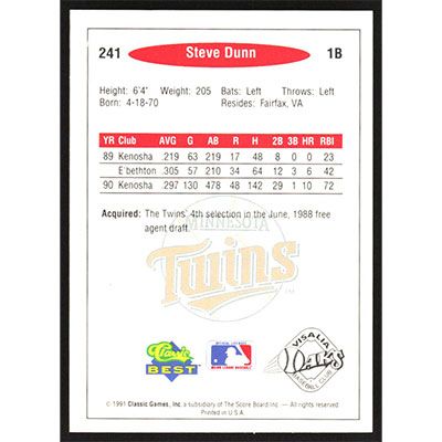 This is a 1991 Classic/Best Steve Dunn baseball card. The card is #241 and pictures show condition.