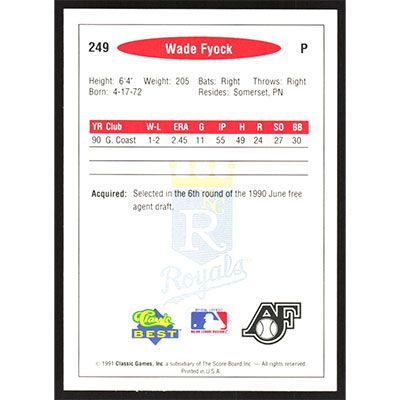 This is a 1991 Classic/Best Wade Fyock baseball card. The card is #249 and pictures show condition.