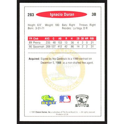 This is a 1991 Classic/Best Ignacio Duran baseball card. The card is #283 and pictures show condition.