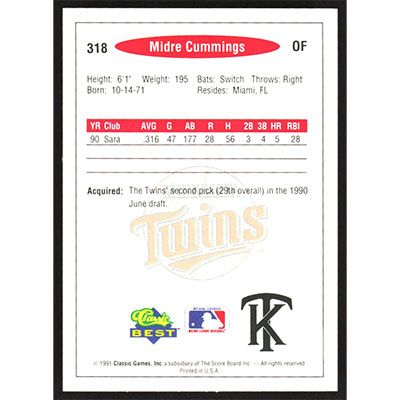 This is a 1991 Classic/Best Midre Cummings baseball card. The card is #318 and pictures show condition.