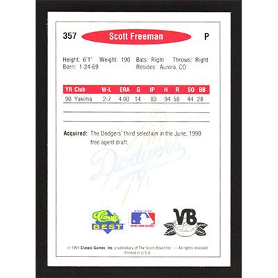 This is a 1991 Classic/Best Scott Freeman baseball card. The card is #357 and pictures show condition.