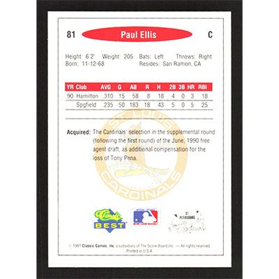 This is a 1991 Classic/Best Paul Ellis baseball card. The card is #81 and pictures show condition.
