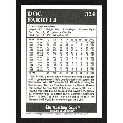 This is a 1991 Conlon TSN Doc Farrell baseball card. The card is #324 and pictures show condition.