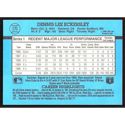 This is a 1991 Donruss Dennis Eckersley baseball card. The card is #270 and pictures show condition.