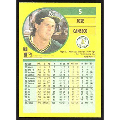 This is a 1991 Fleer Jose Canseco baseball card. The card is #5 and pictures show condition.