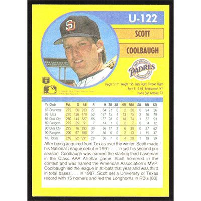 This is a 1991 Fleer Update Scott Coolbaugh baseball card. The card is #U-122 and pictures show condition.