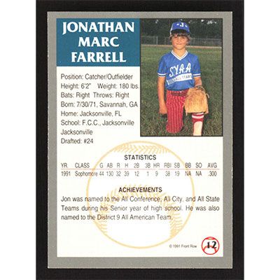 This is a 1991 Front Row Draft Picks Jon Farrell baseball card. The card is #12 and pictures show condition. Team(s): Florida Community College Stars
