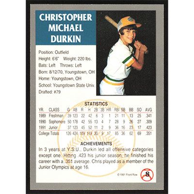 This is a 1991 Front Row Draft Picks Chris Durkin baseball card. The card is #8 and pictures show condition.