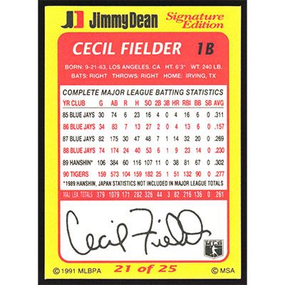 This is a 1991 Jimmy Dean Cecil Fielder baseball card. The card is #21 and pictures show condition.