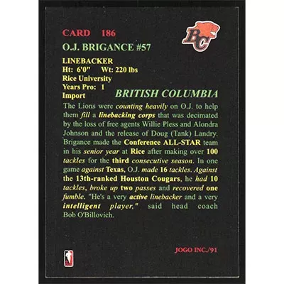 This is a 1991 JOGO O.J. Brigance football card. The card is #186 and pictures show condition.