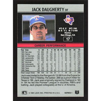 This is a 1991 Leaf Jack Daugherty baseball card. The card is #17 and pictures show condition.