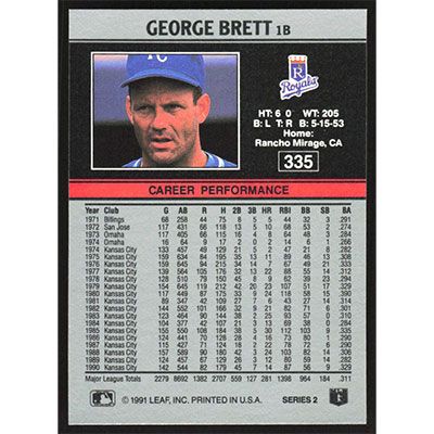 This is a 1991 Leaf George Brett baseball card. The card is #335 and pictures show condition.