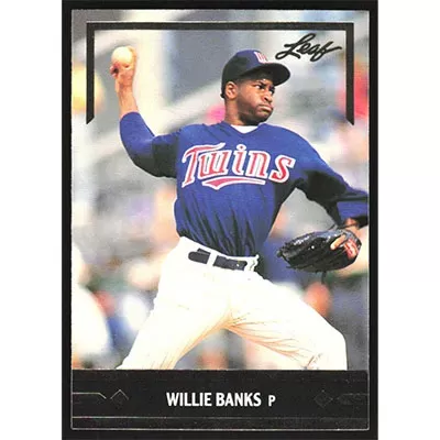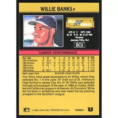 This is a 1991 Leaf Gold Rookies Willie Banks baseball card. The card is #BC5 and pictures show condition.