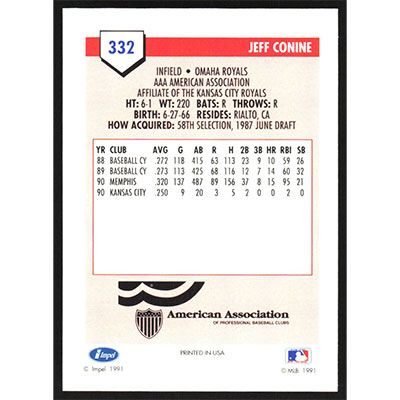 This is a 1991 Line Drive AAA Jeff Conine baseball card. The card is #332 and pictures show condition.