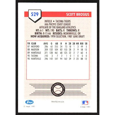 This is a 1991 Line Drive AAA Scott Brosius baseball card. The card is #529 and pictures show condition.
