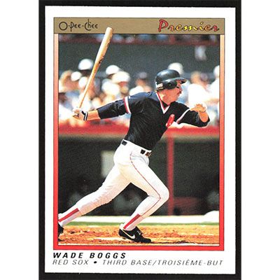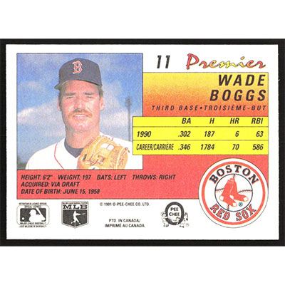 This is a 1991 O-Pee-Chee Premier Wade Boggs baseball card. The card is #11 and pictures show condition.
