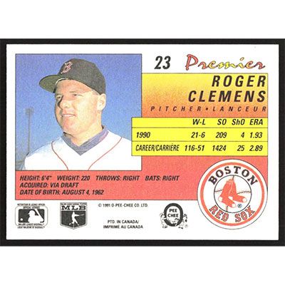 This is a 1991 O-Pee-Chee Premier Roger Clemens baseball card. The card is #23 and pictures show condition.