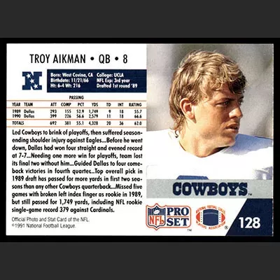 This is a 1991 Pro Set Troy Aikman football card. The card is #128 and is in NM-MT condition.
