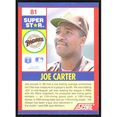 This is a 1991 Score 100 Superstars Joe Carter baseball card. The card is #81 and pictures show condition.