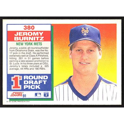 This is a 1991 Score Jeromy Burnitz baseball card. The card is #380 and pictures show condition.