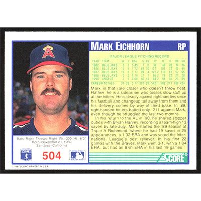 This is a 1991 Score Mark Eichhorn baseball card. The card is #504 and pictures show condition.