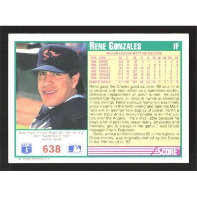 This is a 1991 Score Rene Gonzales baseball card. The card is #638 and pictures show condition.