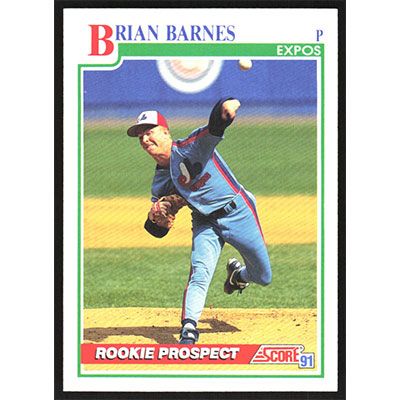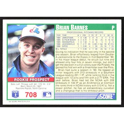 This is a 1991 Score Brian Barnes baseball card. The card is #708 and pictures show condition.