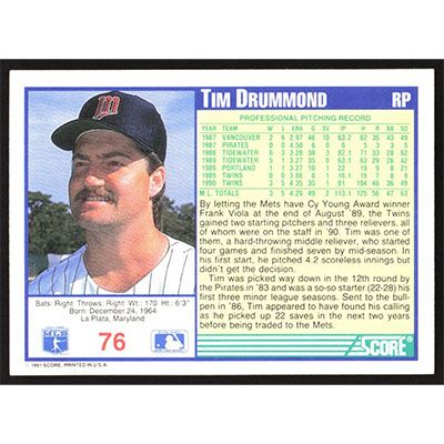 This is a 1991 Score Tim Drummond baseball card. The card is #76 and pictures show condition.