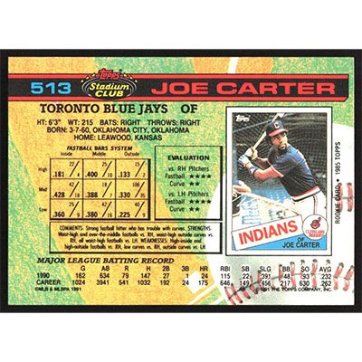 This is a 1991 Stadium Club Joe Carter baseball card. The card is #513 and pictures show condition.