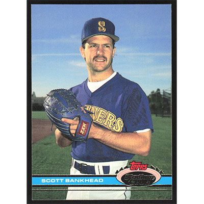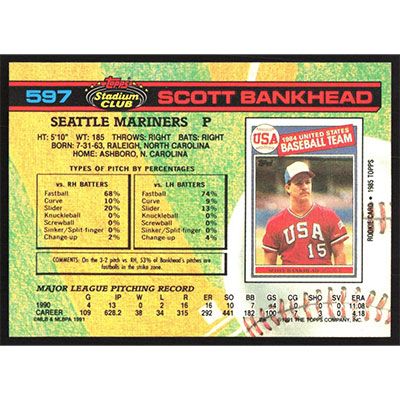 This is a 1991 Stadium Club Scott Bankhead baseball card. The card is #597 and pictures show condition.