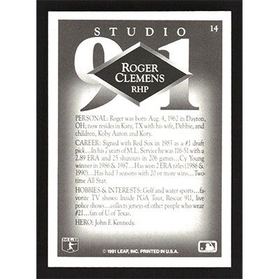 This is a 1991 Studio Roger Clemens baseball card. The card is #14 and pictures show condition.