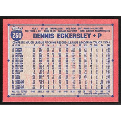 This is a 1991 Topps Dennis Eckersley baseball card. The card is #250 and pictures show condition.