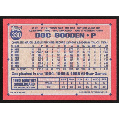 This is a 1991 Topps Doc Gooden baseball card. The card is #330 and pictures show condition.