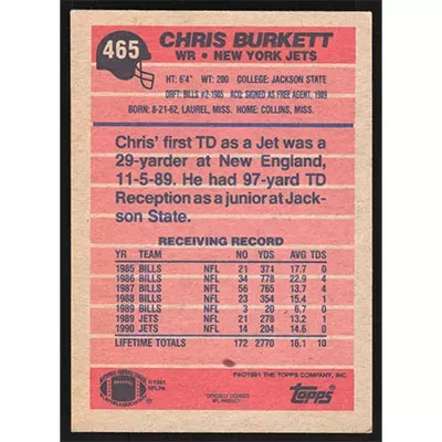 This is a 1991 Topps Chris Burkett football card. The card is #465 and pictures show condition.