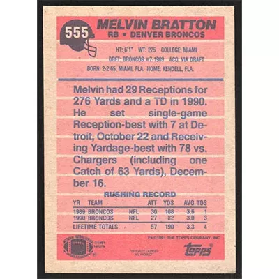 This is a 1991 Topps Melvin Bratton football card. The card is #555 and pictures show condition.