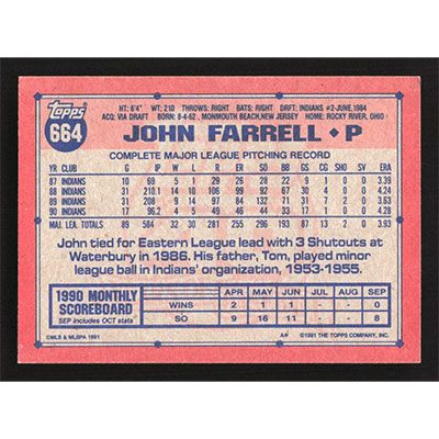 This is a 1991 Topps John Farrell baseball card. The card is #664 and pictures show condition.