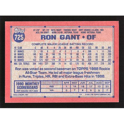 This is a 1991 Topps Ron Gant baseball card. The card is #725 and pictures show condition.