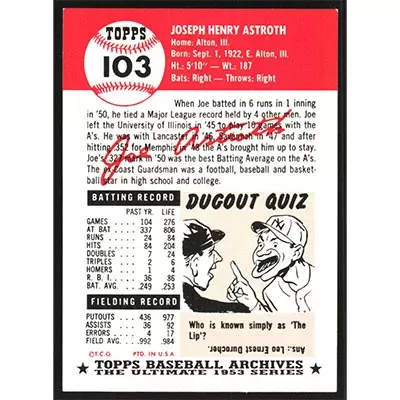 This is a 1991 Topps Archives 1953 Joe Astroth baseball card. The card is #103 and pictures show condition.
