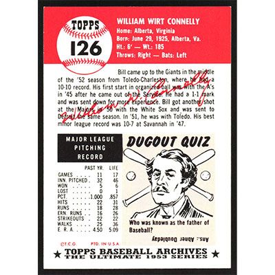 This is a 1991 Topps Archives 1953 Bill Connelly baseball card. The card is #126 and pictures show condition.