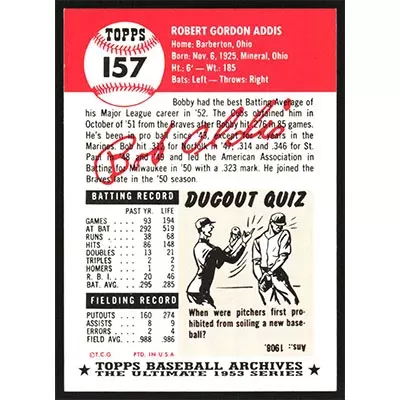 This is a 1991 Topps Archives 1953 Bob Addis baseball card. The card is #157 and pictures show condition.