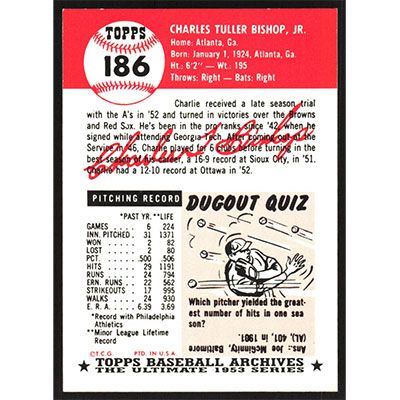 This is a 1991 Topps Archives 1953 Charlie Bishop baseball card. The card is #186 and pictures show condition.