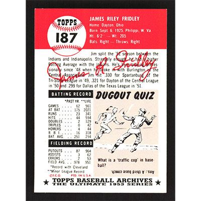 This is a 1991 Topps Archives 1953 Jim Fridley baseball card. The card is #187 and pictures show condition.