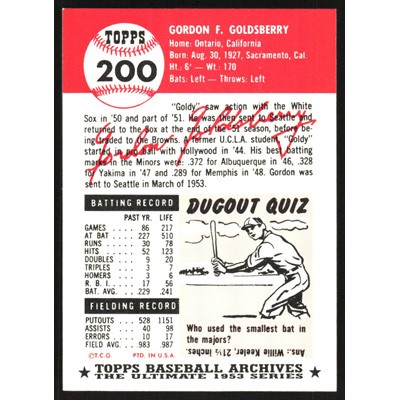 This is a 1991 Topps Archives 1953 Gordon Goldsberry baseball card. The card is #200 and pictures show condition.