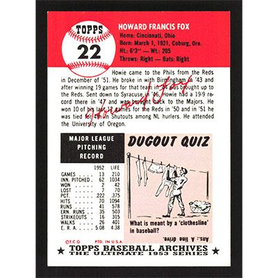 This is a 1991 Topps Archives 1953 Howie Fox baseball card. The card is #22 and pictures show condition.